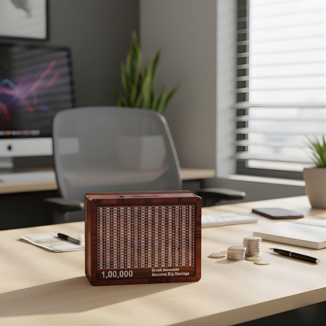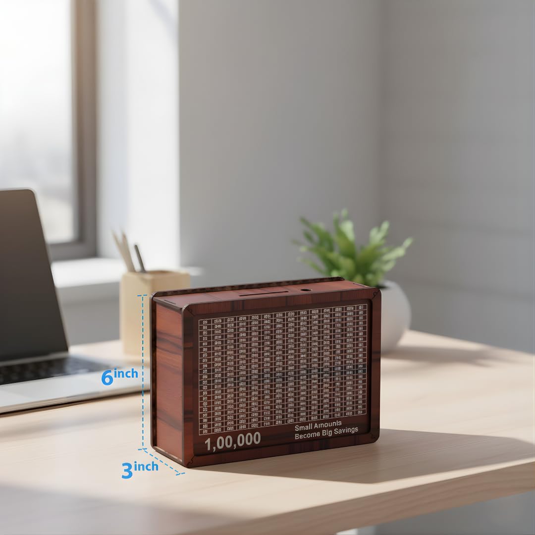 A wooden money-saving box designed to hold up to 1 lakh (100,000) is a sturdy and elegant solution for those looking to save large amounts of money. Made from high-quality, durable wood, this box is crafted to handle both the weight and volume of cash over time. The box features a built-in manual counting system that helps track the total amount of money inside. Each time you insert a note, the counter automatically increments, keeping an accurate tally of your savings. This box is typically designed with a secure locking mechanism to ensure the safety of your savings, preventing unauthorized access. Its aesthetic appeal makes it a stylish addition to any room, while the ability to store a large sum—up to 1 lakh—makes it an ideal choice for those with big financial goals. The sturdy wooden construction adds a timeless touch, and it's a perfect blend of functionality and craftsmanship.